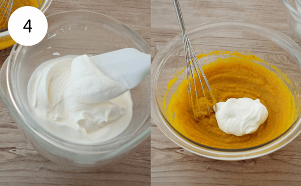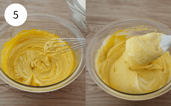 5. 残りの生クリームとかぼちゃを合わせ、ゴムベラで混ぜる。混ぜすぎるとボソボソした食感になるので、底からすくうようにふんわりと混ぜる。