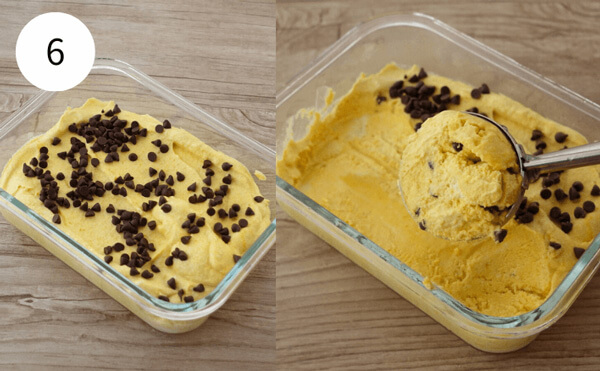 6. 容器に5のアイス生地を入れ、チョコチップを乗せて5~6時間冷凍する(途中で混ぜる必要はありません)。アイス生地が凍ったら、5~10分ほど常温におくとアイスが軟らかくなり、ディッシャーですくいやすくなる。