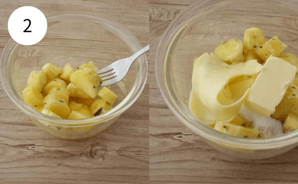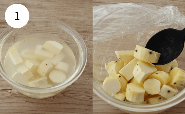 1. さつまいもの皮をむき、2~3cm幅に切る。耐熱ボウルにさつまいもを入れ、5分ほど水にさらしたあと、水を捨てる。水100ml(分量外)を加え、ふんわりラップをして600Wの電子レンジで3分加熱する。