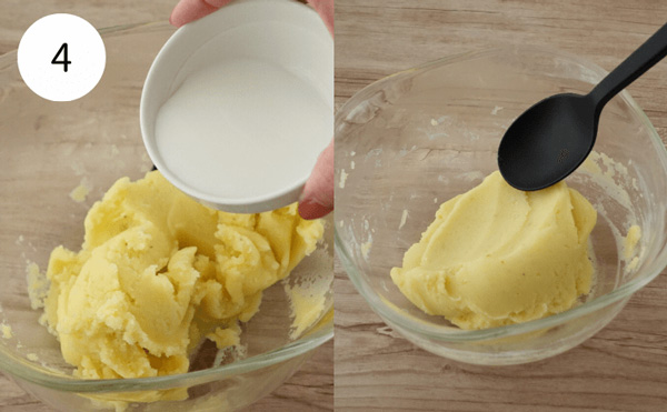 4. 3のさつまいもに少しずつ牛乳を加える。表面のボソボソ感がなくなり、一塊になるまで牛乳を加えながらよく混ぜる(さつまいもの水分量によって牛乳の量を調整してください)。