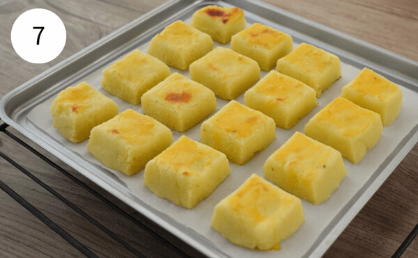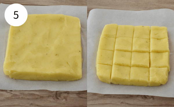 5. クッキングシートの上にさつまいも生地を乗せ、約14×14cmの大きさに整える。食べやすい大きさに包丁で切り分ける(今回は約3.5cm幅でカットしています)。