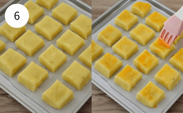 6. さつまいもの表面に溶いた卵黄を塗る。