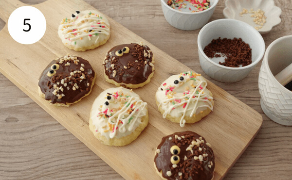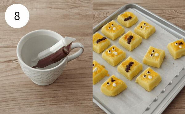 8. チョコペンを湯せんで溶かし、目やコウモリを描いたら完成です。