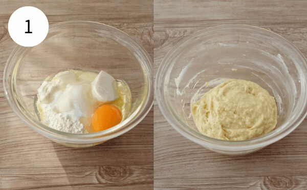 1. ボウルにホットケーキミックスを入れ、たまご、砂糖、サラダ油、豆腐を加えてよく混ぜる。