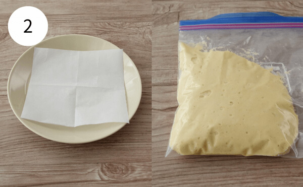 2. クッキングシートを15×15cmの大きさに切り、四つ折りにして折り目をつける。フリーザーバッグに1の生地を入れ、袋の端を幅2cmの大きさに切る。