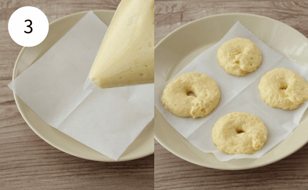 3. 耐熱皿にクッキングシートをのせ、折り目を目安に丸く生地を絞る。加熱すると約1.5倍に膨らむので、隣の生地との間隔を2cmほど空ける。600Wの電子レンジで1分30秒加熱する。