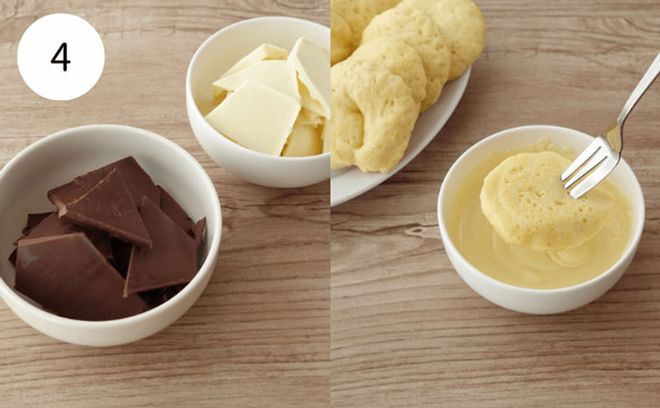 4. チョコレートを3~5cmの大きさに割り、耐熱容器に入れて、湯せん、もしくは600Wの電子レンジで20秒ずつ加熱し溶かす。滑らかになるまでよく混ぜる。ケーキ生地の後ろからフォークを刺し、表面にチョコレートをつける。