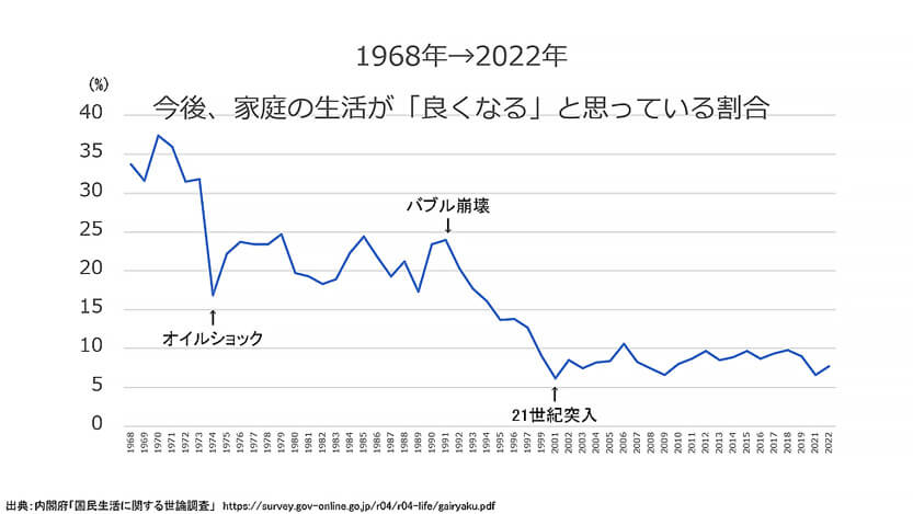 1968年は40%近くが「よくなる」と答えましたが、以降は低下傾向が続き、21世紀に入ったころからは8%前後での推移。なんと9割以上の人が、家庭の今後について、前向きな希望を持てていないということになります。