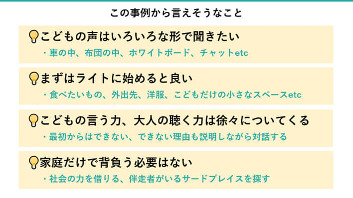 石川氏 直接話すことにこだわらず、間接的に声を聴くことも有効です。子どもは自分の居心地がよい場所で本音を語りやすいので、子どもを見守る先生やスタッフから間接的に子どもの思いを聴くことができます。なかには、二度と会わない人が集まる一回限りの場のほうが、本音を言いやすい子どももいます。声を聴けそうな場を、さまざまに探してみるとよいでしょう。
