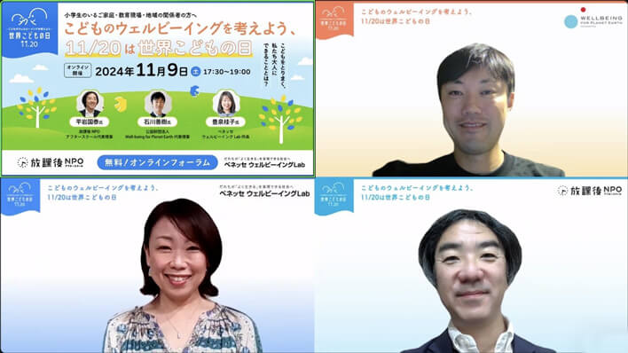 昨今社会的なテーマになりつつある、ウェルビーイング(=ココロも、カラダも、社会的にもよい状態のこと)。子どものウェルビーイングについて、家庭や学校、地域でどう考えることができるのでしょうか。「世界こどもの日(11月20日)」を契機に、3人の識者が意見を交わしました。