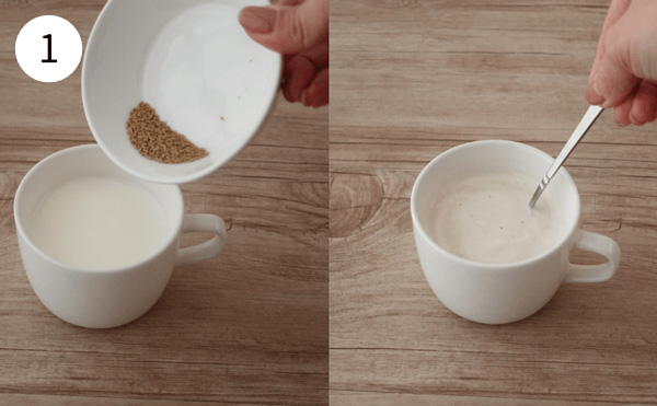 1. マグカップに牛乳を入れ、600Wの電子レンジで1分30秒加熱する。和風だしの素を加え、よく混ぜる。