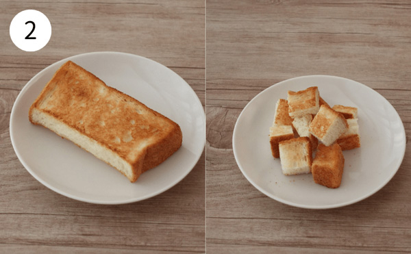 2. 食パンをトースターで焼き目が付くまで焼き、食べやすい大きさに切る。