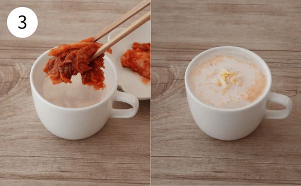 3. 1の牛乳にキムチとチーズを加え、600Wの電子レンジで30秒加熱したら完成です。