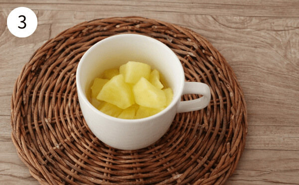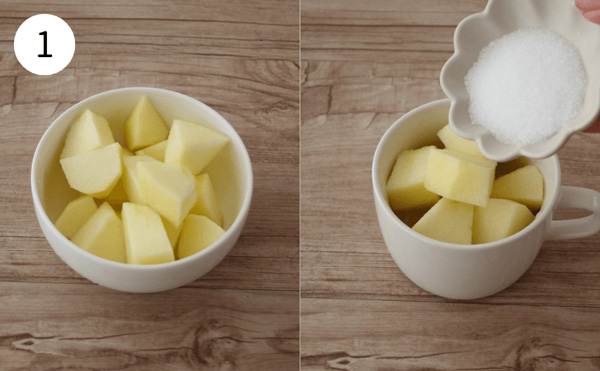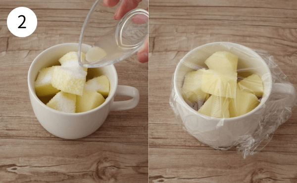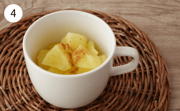 1. りんごの皮をむき、食べやすい大きさに切る(約5cm程度)。マグカップに入れ、砂糖をまぶす。