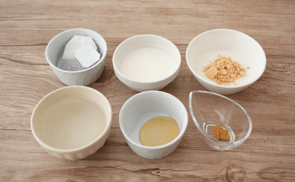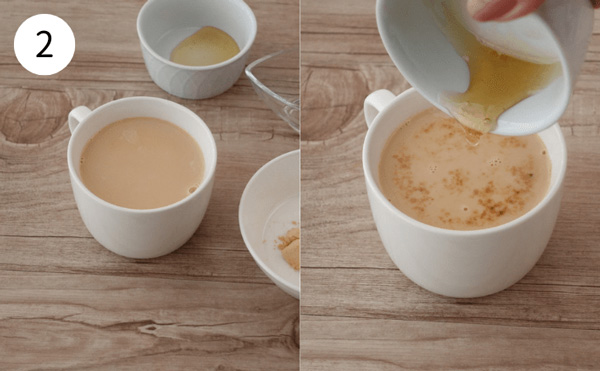 2. 1の紅茶に、きな粉、ショウガ、はちみつを加え、よく混ぜたら完成です。