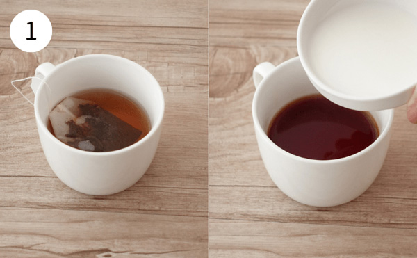 1. マグカップに紅茶ティーバッグを入れ、熱湯を注ぎ2分間抽出する。牛乳を600Wの電子レンジで30秒加熱し、紅茶に入れる。