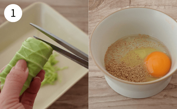 1. キャベツの葉をさっと水洗いし、丸める。キッチンばさみや包丁で細く切る。大きめのカップにたまご、水、和風だしの素を入れる。
