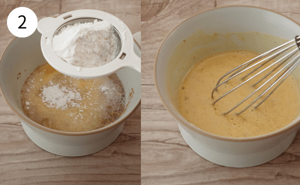 2. 1のカップに薄力粉を加える。薄力粉は茶こしでふるいながら加えると、ダマになりにくいですよ。和風だしの素が溶けるまでよく混ぜる。