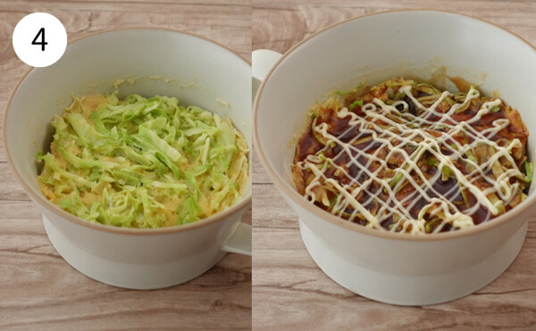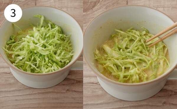 3. 2のカップにキャベツを加え、よく混ぜる。生地が全体になじんだら、600Wの電子レンジで3分加熱する。