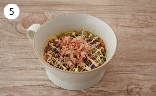 4. ドロドロした生地が残っていたら10秒ずつ追加で加熱してください。お好みでソースとマヨネーズで味付けする。