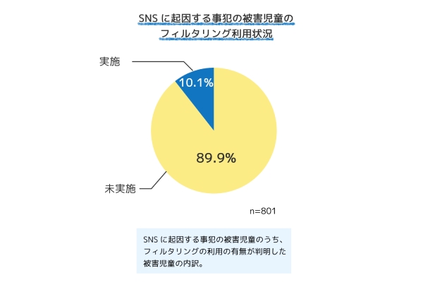 たとえば令和6年の警察庁による統計データ(※1)によると、SNSに起因する犯罪被害に遭った子どもの約89.9%が、フィルタリングを使用していませんでした。これは同年の平均フィルタリング実施率(約46% ※2-P20)を上回る数値です。