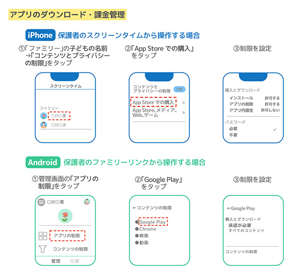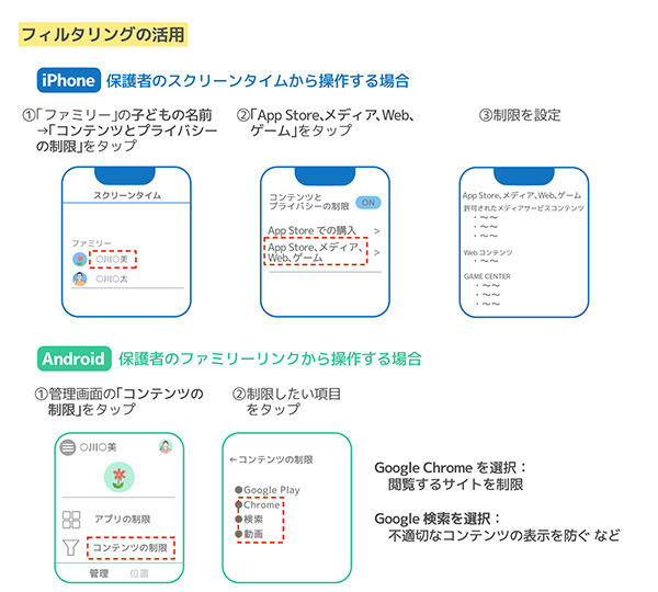 ここでは、「アプリのダウンロードや課金の管理」と「フィルタリングの活用」についてご紹介します。