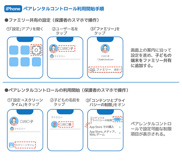 iPhoneでは、「ファミリー共有」を設定することで、保護者のスマホから子どものスマホの遠隔管理を可能にしたうえで、「スクリーンタイム」を使ってペアレンタルコントロールを実施します。