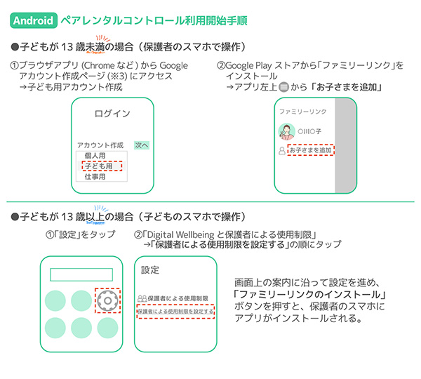 Androidでは、Googleの「ファミリーリンク」アプリを使うことでiPhoneと同様の管理が可能です。ファミリーリンクを利用する場合、子どもが13歳未満なら保護者のスマホから、13歳以上なら子どものスマホから設定を開始します。