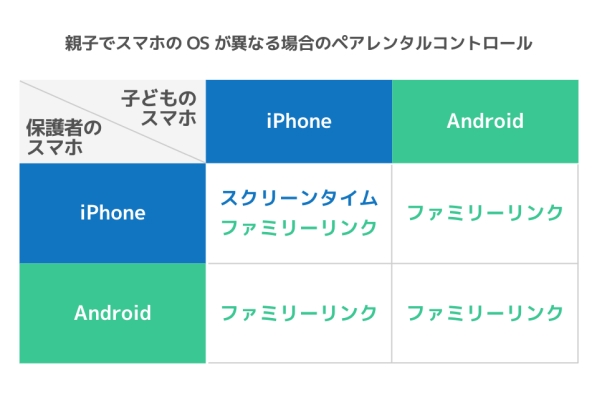 親子それぞれのスマホのOSと、おすすめのペアレンタルコントロールを表にまとめました。