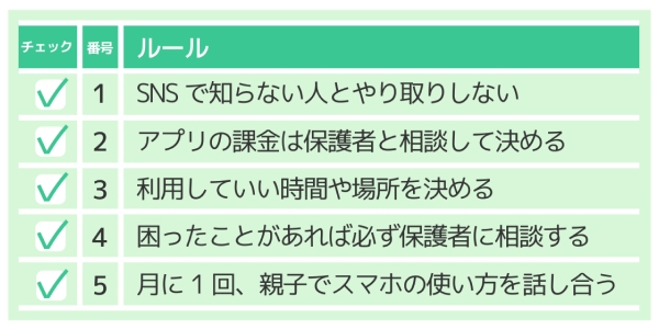 このチェックリストを見ながら、月に1回ほど親子でスマホの使い方について話し合うのもおすすめです。1か月の利用状況を振り返り、ルールを守って使用できたか子どもに聞いてみましょう。
