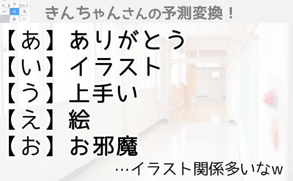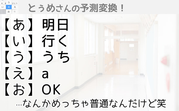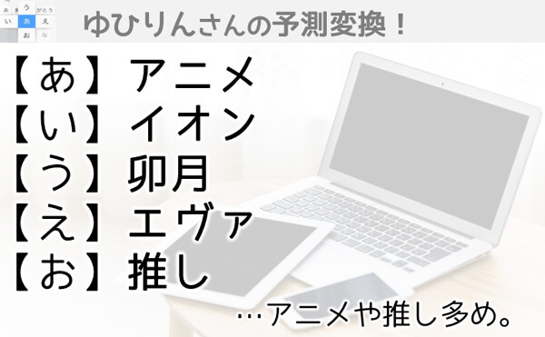 以上、「あ行」の予測変換についてはたとえばこんな形ということで、推し系が多いのも印象的ですが、子どもたちは各自スマホで、趣味嗜好(しこう)に基づいたコミュニケーションを行っているようです。