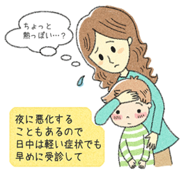 子どもの場合は症状が急変することもありますが、なんとなく午前中から調子が悪いなど先に軽い症状が出ていることも多いですので、気になる様子がみられたら、昼のうちに早めに受診しておくといいでしょう。