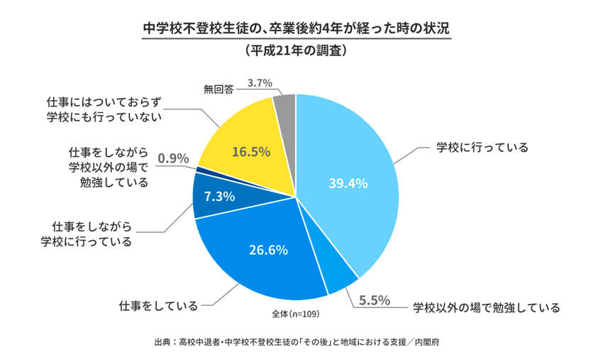 不登校を経て、進路やキャリアを築いていくことももちろん可能です。こちらは過去のデータですのであくまで参考としての情報ですが、内閣府の平成21年の調査によると、中学校不登校生徒の卒業約4年後の状況は次のとおりです(※2)。