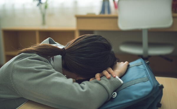 もし、学校を休んで寝てばかりいるとしたら、それは極度な緊張で疲れ果てた体を休めている状態です。ほんとうに十何時間も眠り続けることもあり、心配になるかもしれませんが、これは安心しているからこそ眠っているのです。