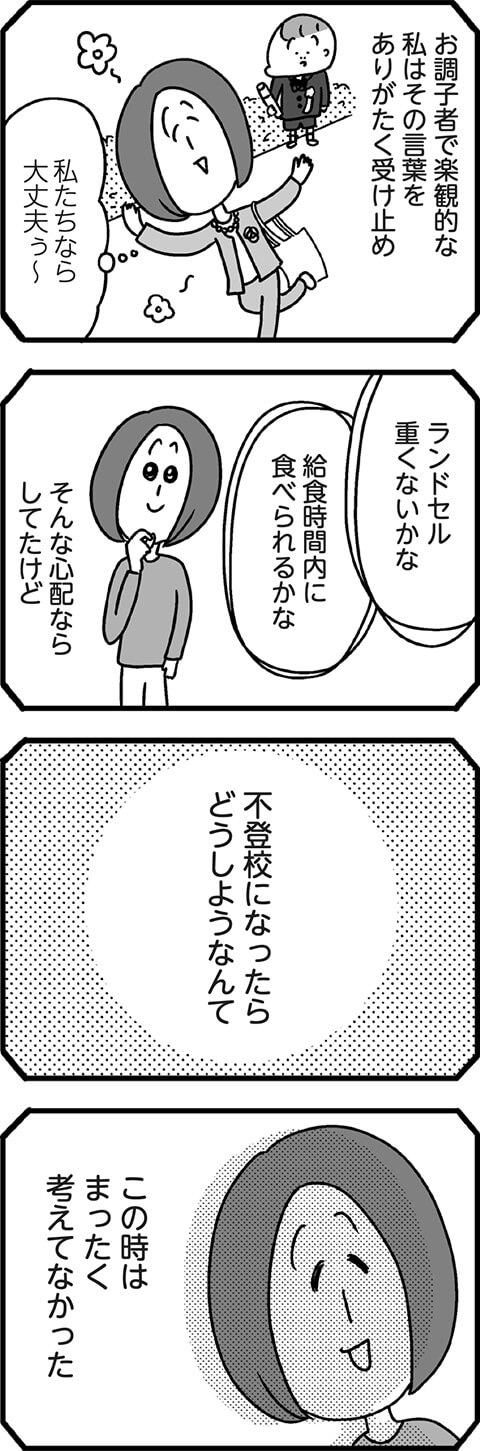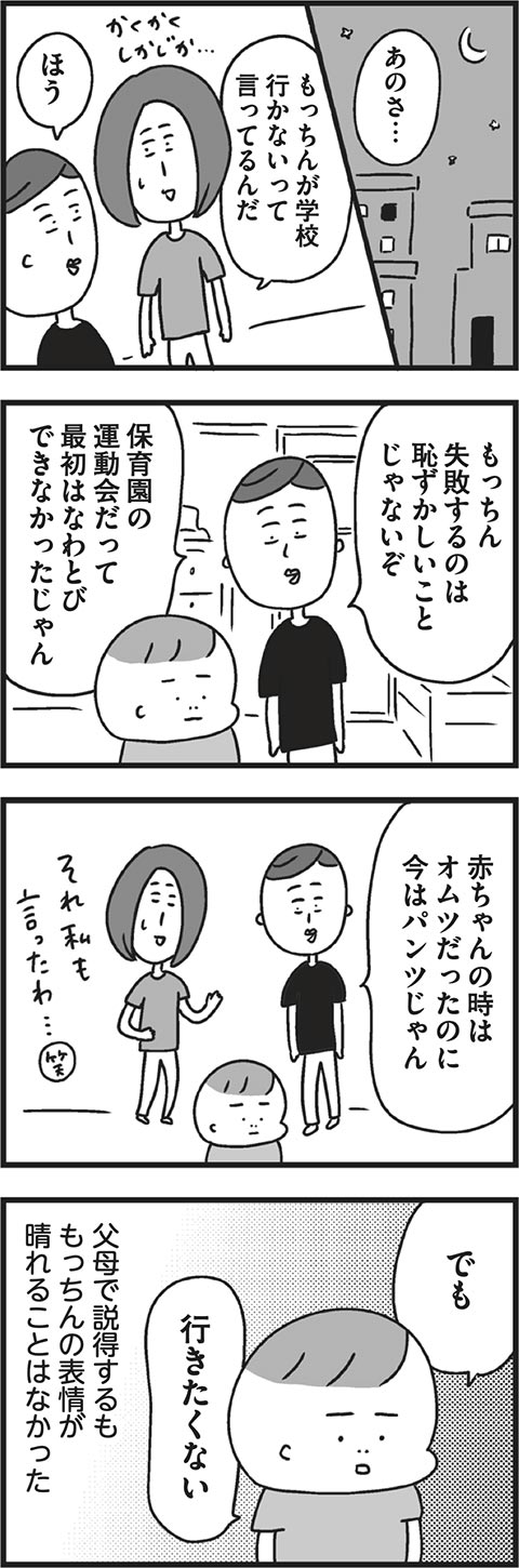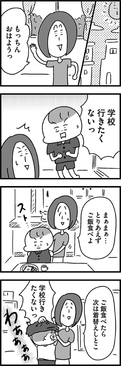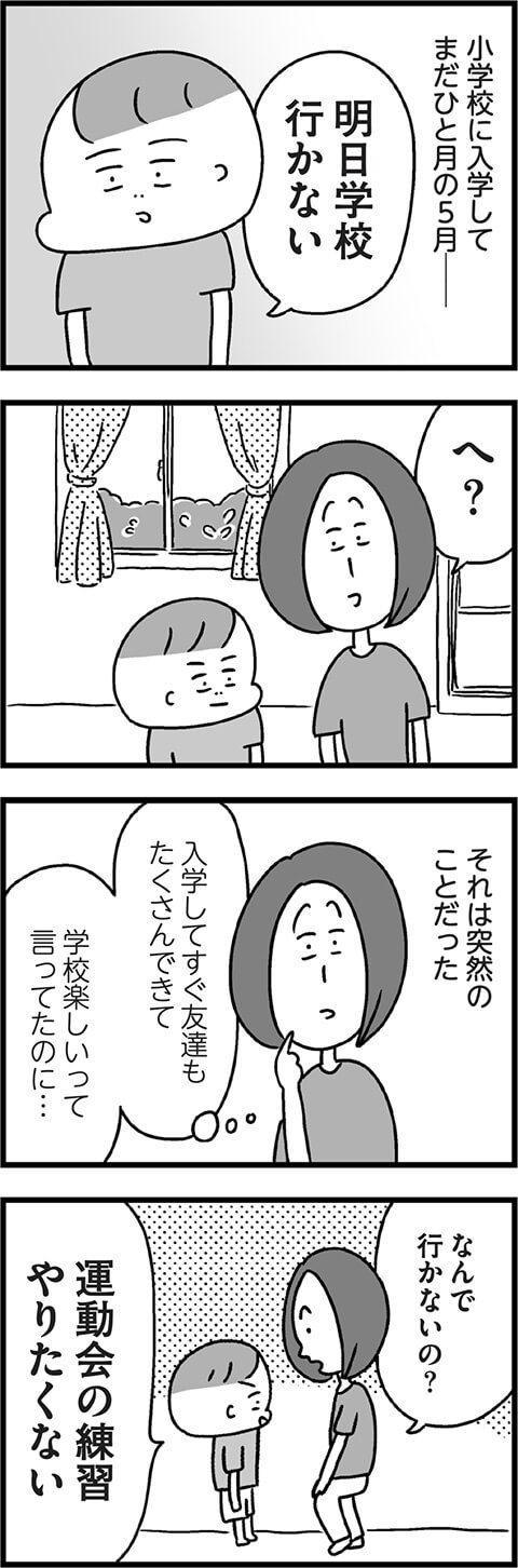 長男もっちんの行き渋りのはじまりは、まだ入学して日の浅い小1の5月。そのきっかけは、保育園までは大好きだったあの行事に関係していたようで……。予想もしていなかった理由に母も戸惑いを隠せないようです。