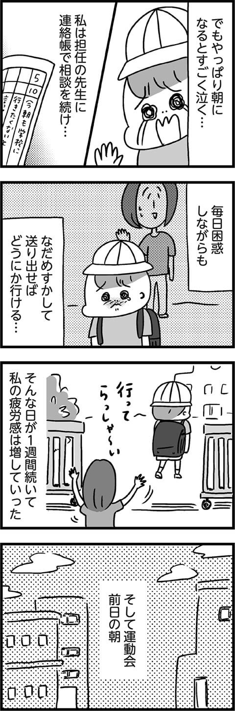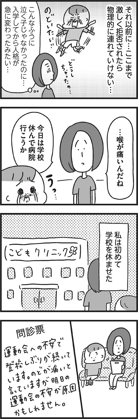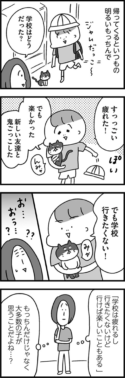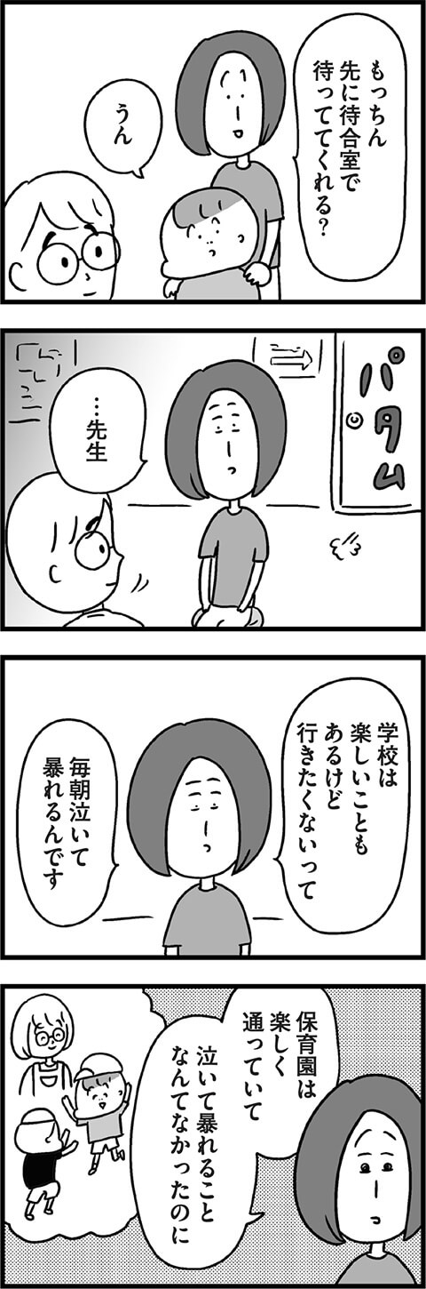運動会の練習がイヤで行き渋りが続いているもっちん。なんとかなだめすかして登校させてはいたものの、ついに事件勃発! いつにも増しての激しい抵抗で、はじめて学校を休ませることになったようで……。