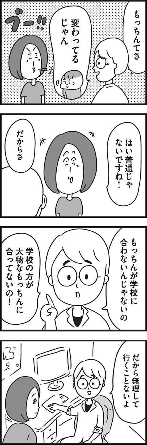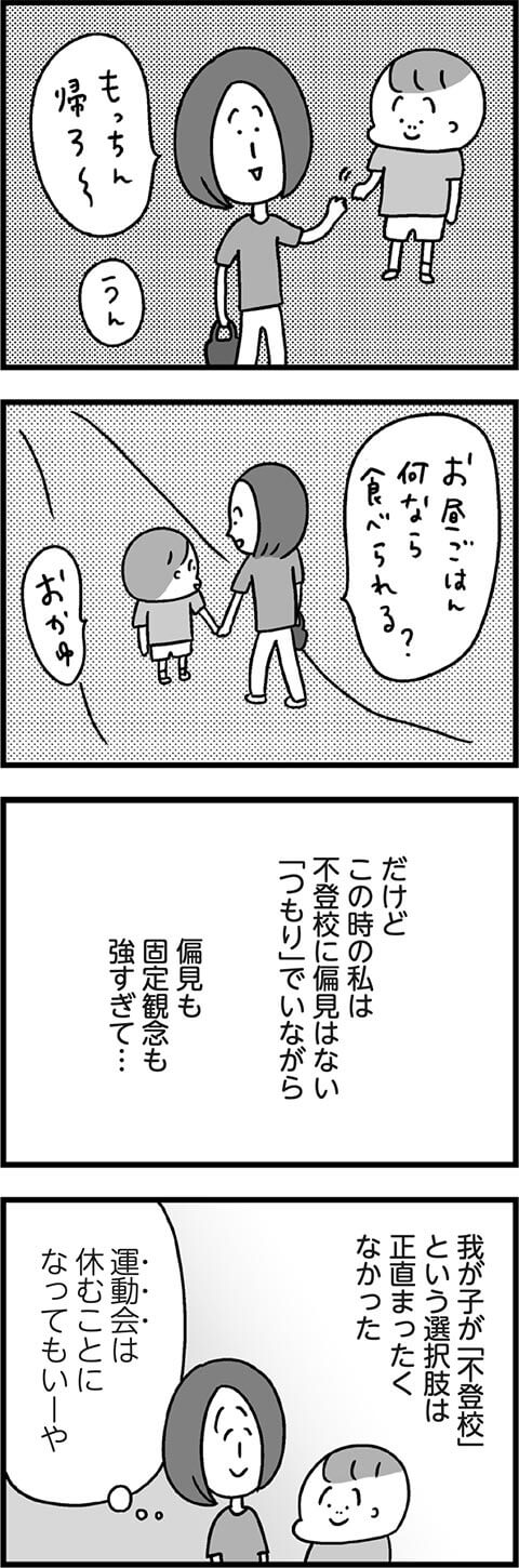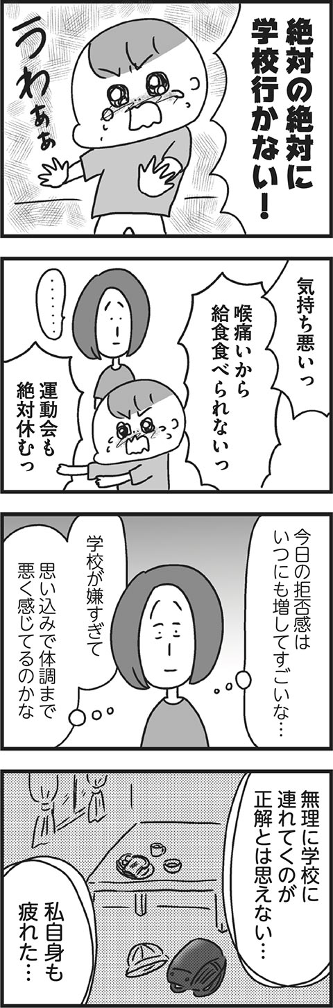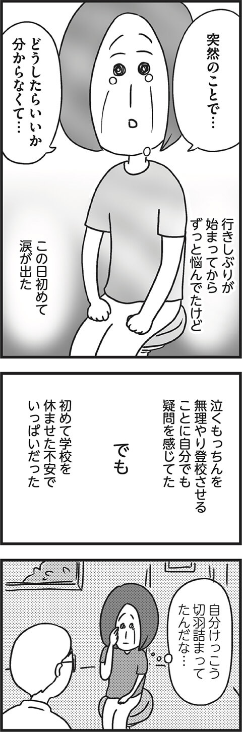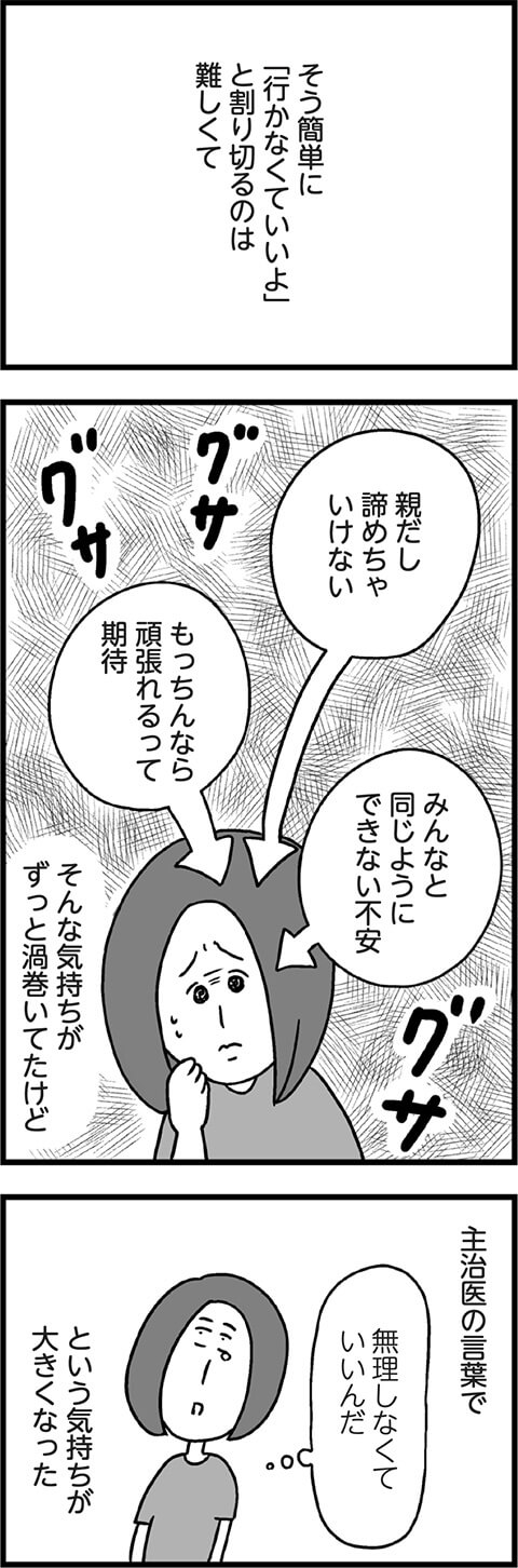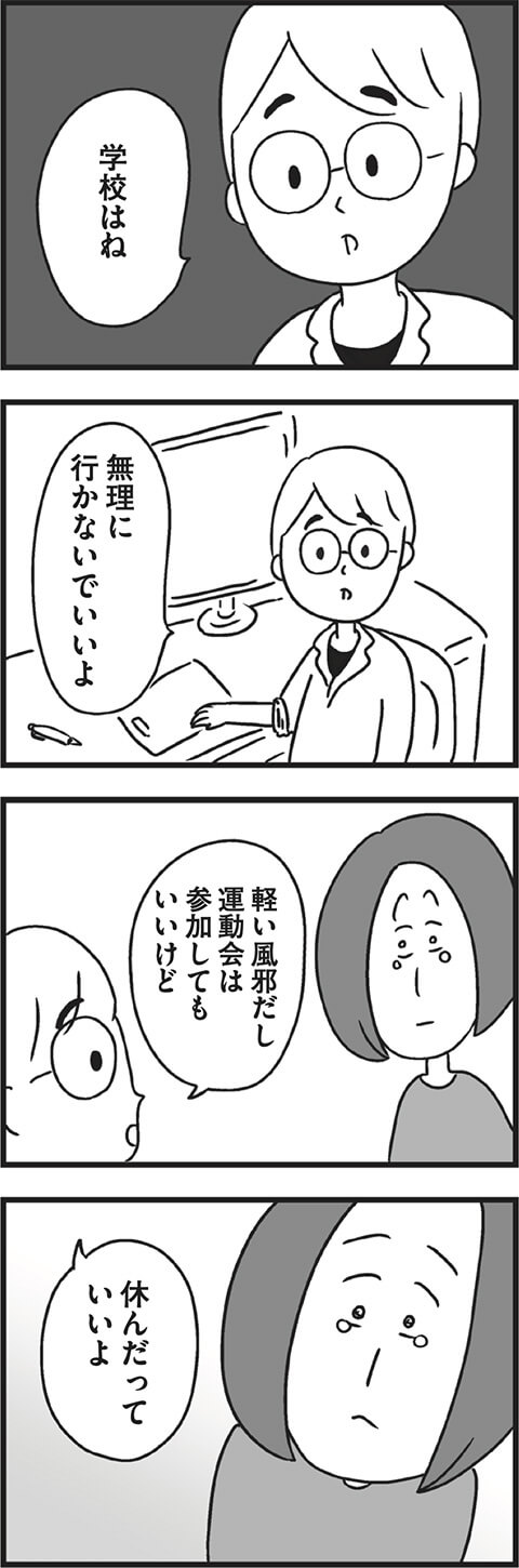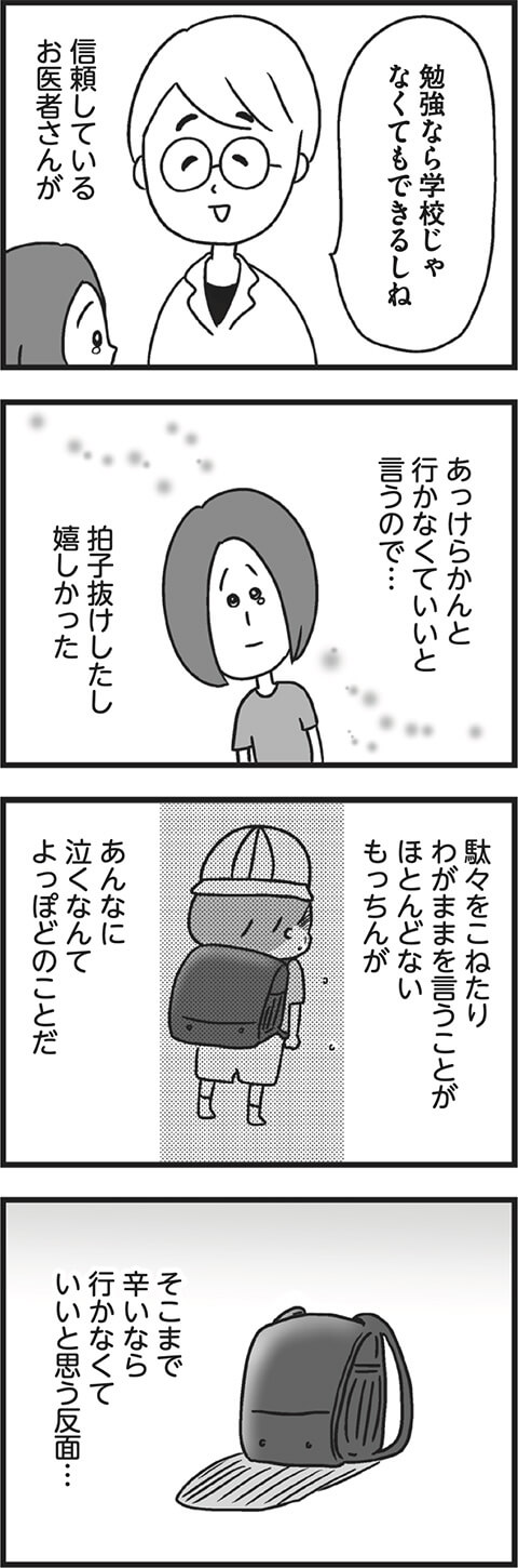 信頼する主治医のあっけらかんとした言葉に救われた母。揺れ動く気持ちを整理して前に進んでいけるかと思いきや、どうやらそう簡単にはいかないようで……。数日のお休みのつもりが、どのように「不登校」の鎧(よろい)に苦しむ日々へとつながっていくのでしょうか。