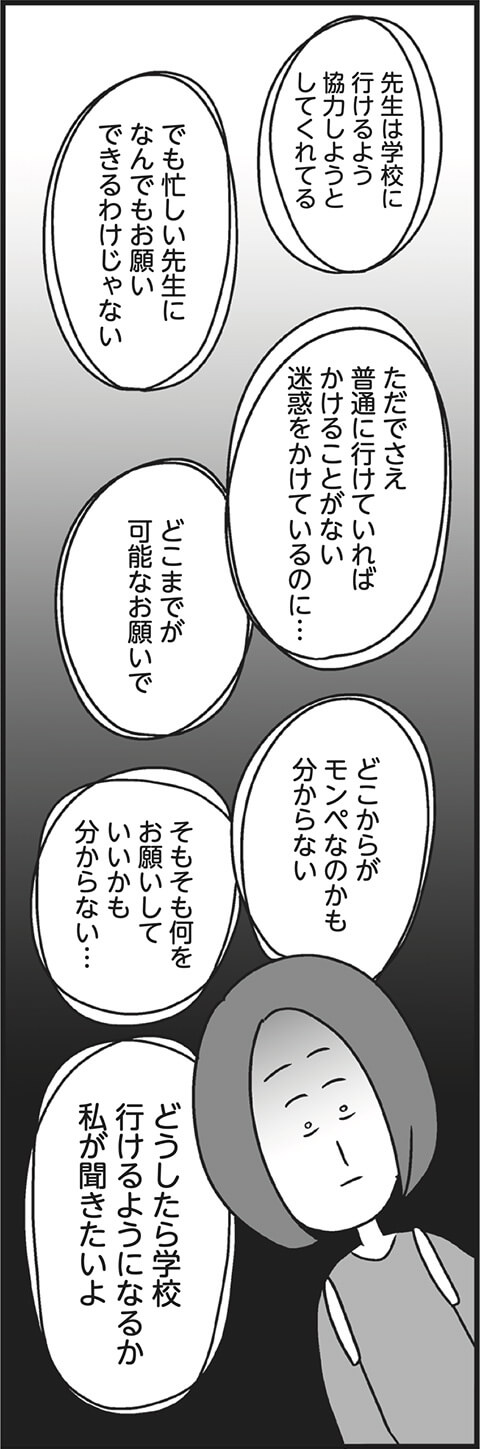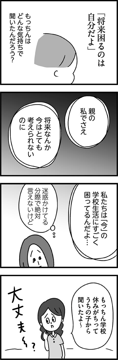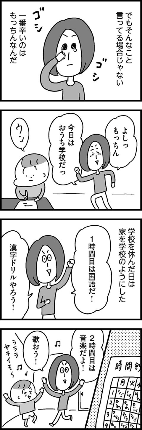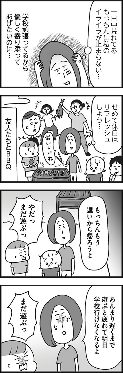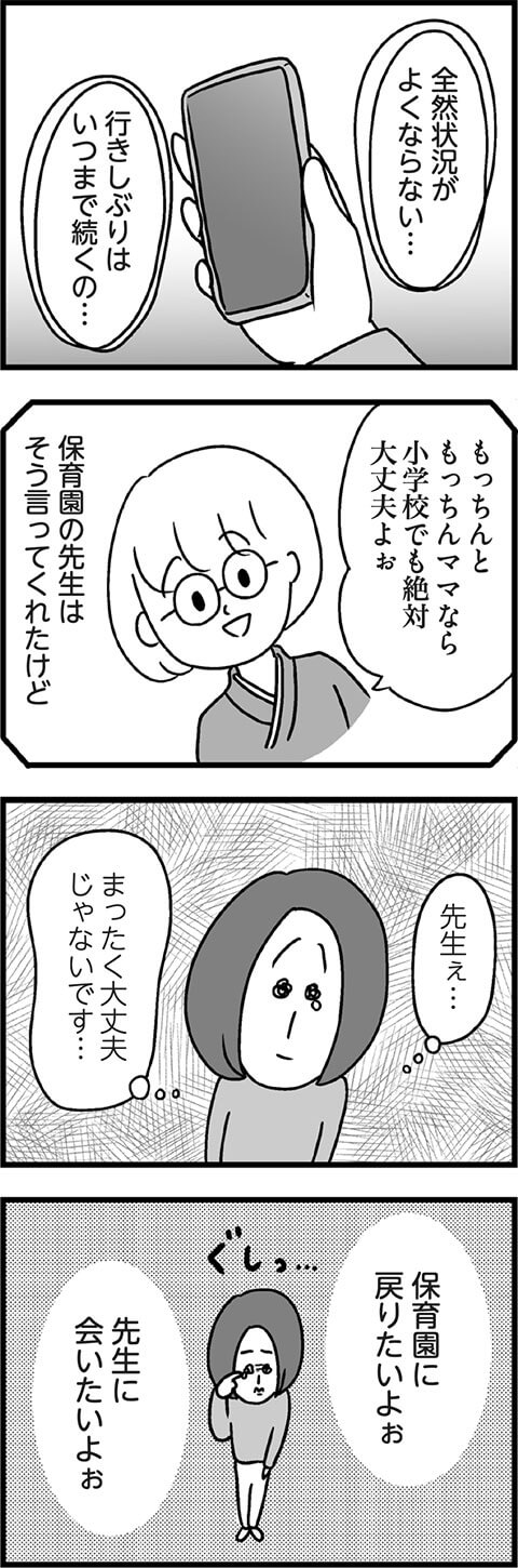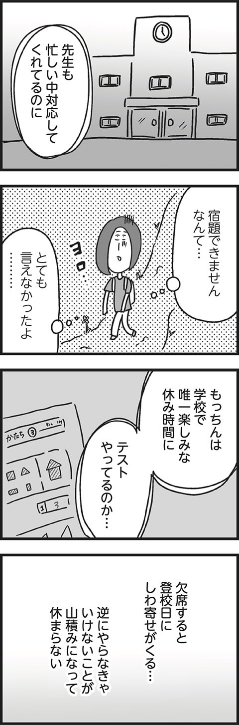 引き続き、行きしぶりが続くもっちん。改善するどころか学校へのストレスが溜まる一方の状況に。もっちんの心に寄り添う母の心にも限界が近付きつつあるようで……。