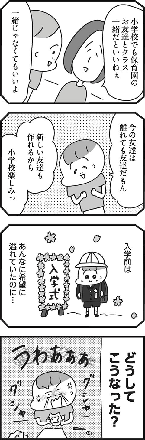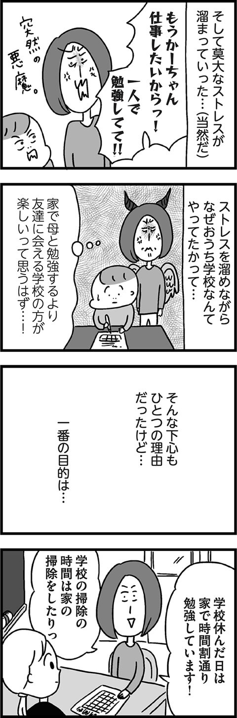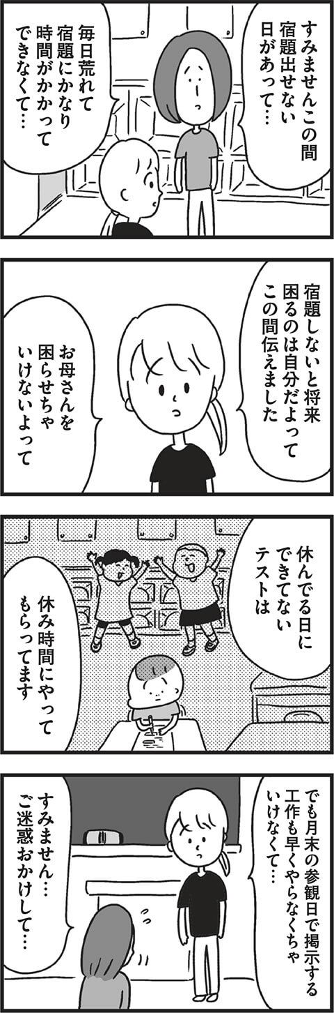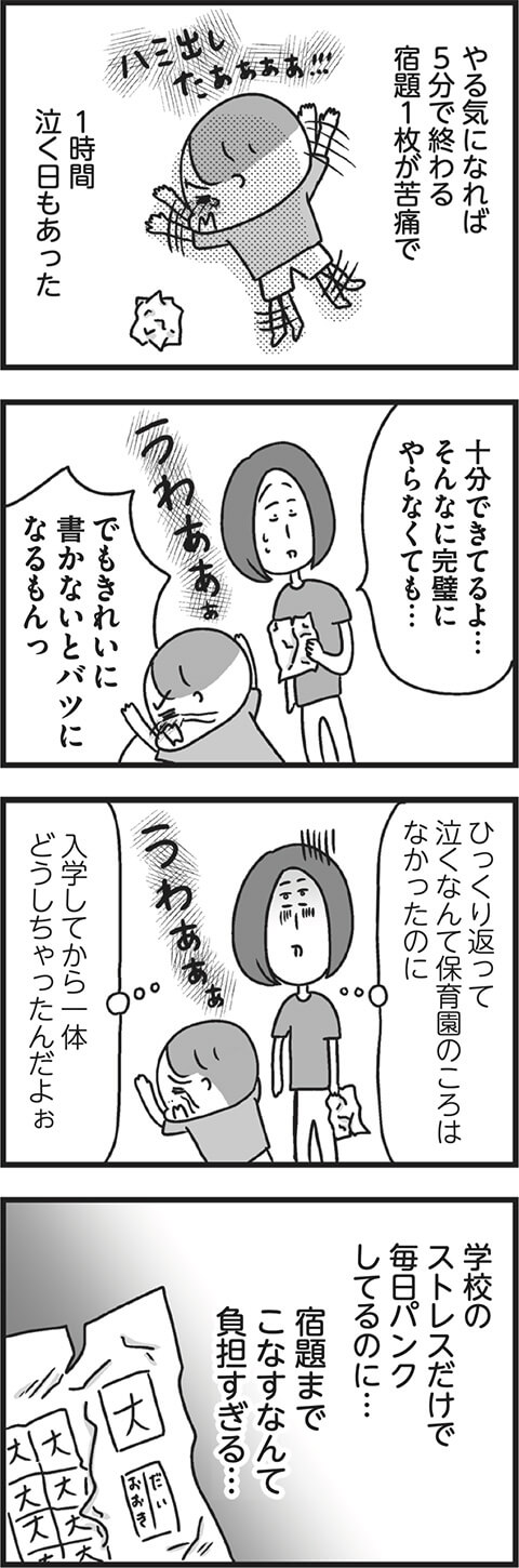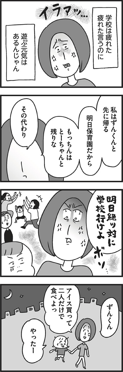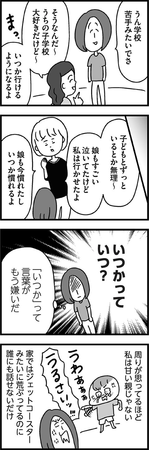 引き続き、行きしぶりが続くもっちん。改善するどころか学校へのストレスが溜まる一方の状況に。もっちんの心に寄り添う母の心にも限界が近付きつつあるようで……。