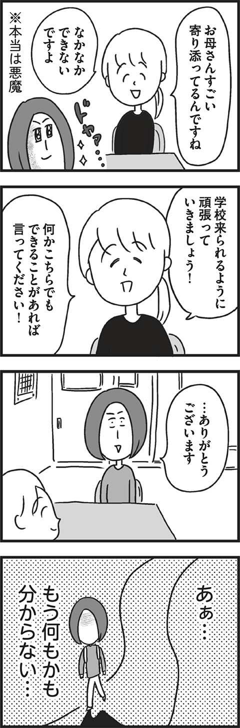 八方塞(ふさ)がりの状況ーー。じりじりと追い詰められていく母の心を思うと、胸が痛みます。せめて、心の内を包み隠さず話せる誰かがいてほしい……そう願わずにはいられません。
