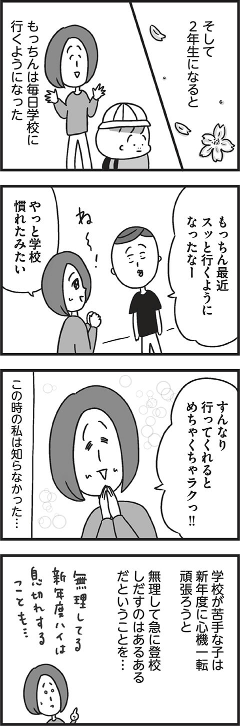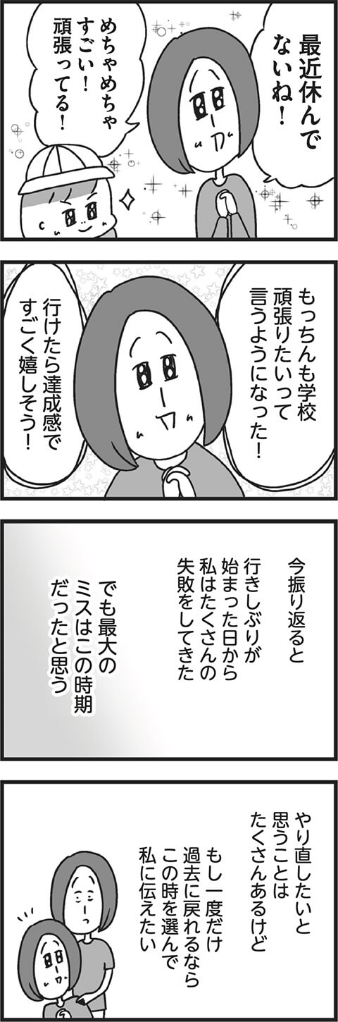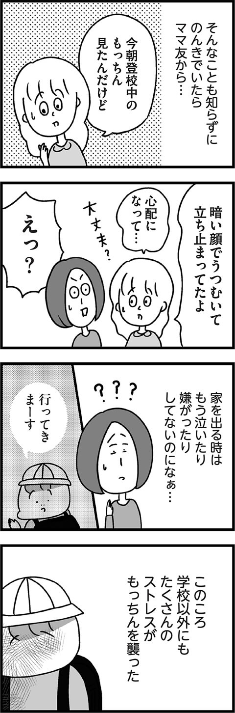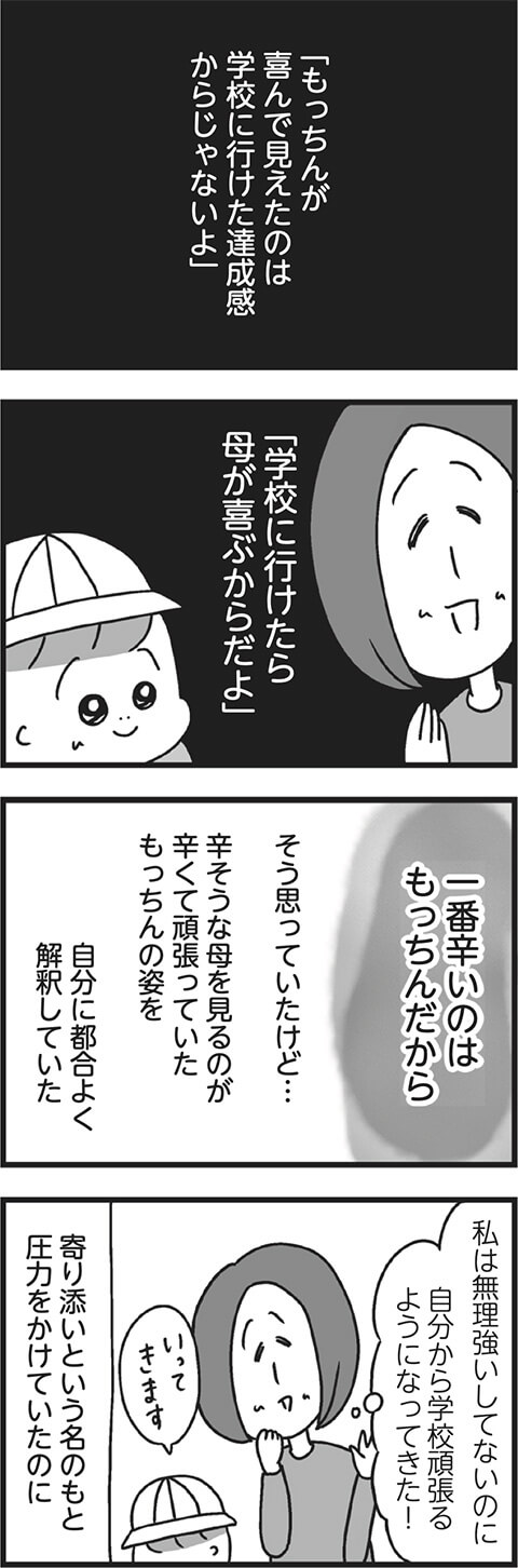 もっちんの行きしぶりへの心配に加え、先生への負い目、周囲の目への恐怖と、心がむしばまれていく母。出口の見えない日々の中、もっちんへの寄り添いを大切にしていたものの、それが逆にもっちんを追い詰めていたようで……。