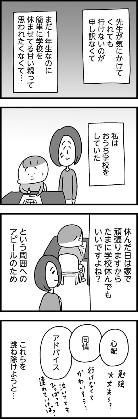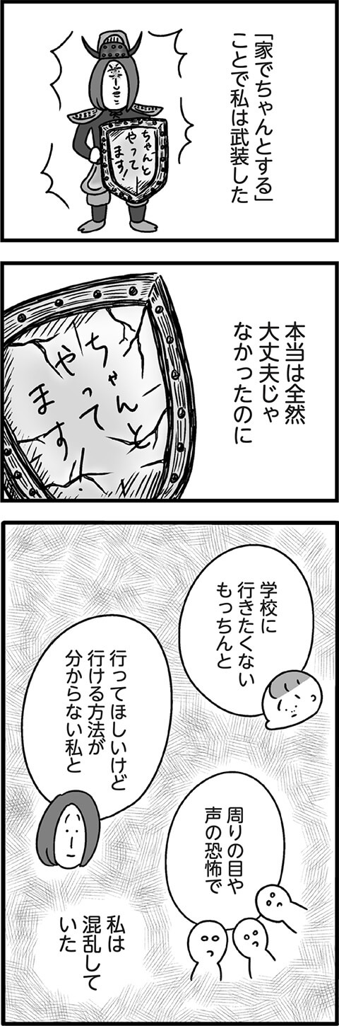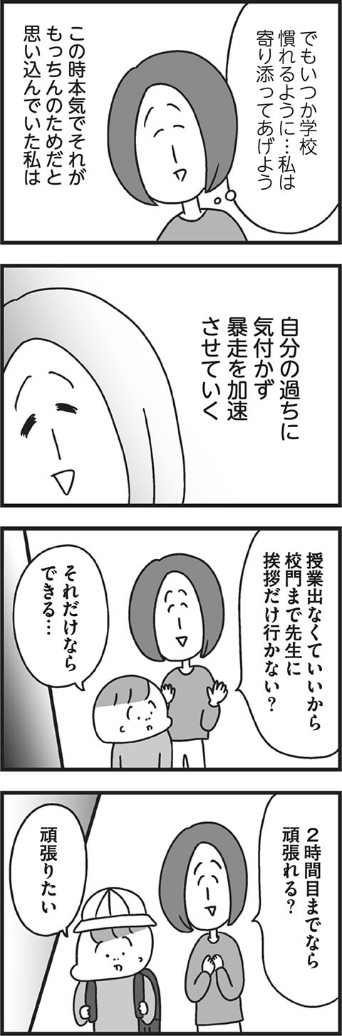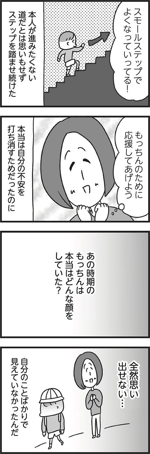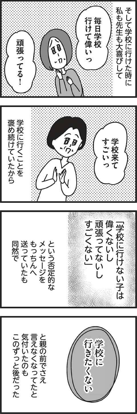 もっちんの行きしぶりへの心配に加え、先生への負い目、周囲の目への恐怖と、心がむしばまれていく母。出口の見えない日々の中、もっちんへの寄り添いを大切にしていたものの、それが逆にもっちんを追い詰めていたようで……。