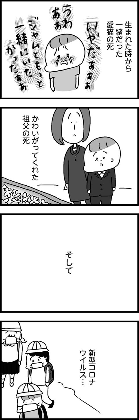 「学校に行きたくない」と言えなくなっていたもっちん。その心の内を想像するだけで胸がつぶれそうになります。さらには、愛猫と祖父の死、新型コロナウイルスの感染拡大まで……。小さな体と心でどれだけの苦しみと戦っていたのでしょうか——。