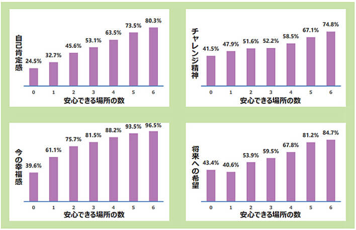内閣府の調査によると、自己肯定感や幸福感は「居場所の数」と強い相関が見られます(※)。家族や親戚、習い事などに加え、ゲームやアニメ、推し活といった好きなことも居場所になりえます。「学校に行っていないんだから」とそれらを制限することは、むしろ避けるべきかもしれません。