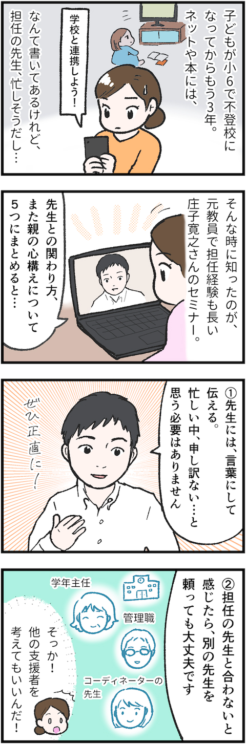 不登校のわが子の相談を担任の先生にするには?庄子 寛之さんのセミナーをふり返る【マンガでセミナーダイジェスト #3】