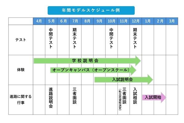 4月は気になる志望校候補をリストアップして説明会や見学日程を確認し、中学校に進路相談を申し入れます。
