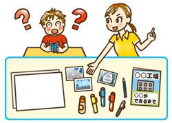 | (1)大きな紙に書く前に、小さな紙にどのような内容(レイアウト)にするのか、書いてみて、全体の構成を決める (2)鉛筆で下書きをして、その上をペンでなぞると失敗しない (3)文字だけでまとめるのではなく、写真やイラストを使ってまとめる。(撮影した写真はプリントをして貼る、パンフレットなどの写真を切って利用する、ホームページなどに使えそうな写真があれば、プリントアウトして使用する、など) (4)目立たせたいところには、背景に色を敷いたり、文字に色を付けるなどして色分けすると目をひくデザインになる (5)文字の大きさに変化をつけて、メリハリが出るようにする |
