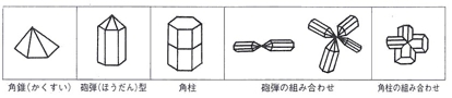 三角錐や六角錐、六角形のふちだけが伸びた結果、刀を収める鞘(さや)のように中空となった砲弾型や、それがいくつも束になったようなものもあります。