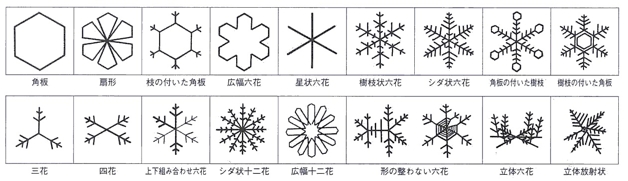 板状結晶には、左右対称の扇形、花や星のような形になっている形のものや、木の枝分かれのように、側枝(そくし)を持つものもあります。中には、単純な六角形ではないもの、枝の張り方に対称性がないものなど、立体型のものなども観察されます。