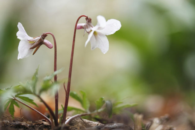 日陰には、花は白く、葉は長三角形のヒカゲスミレが咲きます。